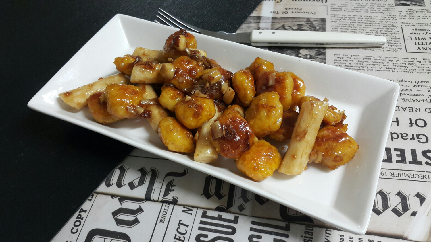 Una deliciosa combinación de bolitas de pollo de palomitas de maíz y pastel de arroz tierno (tteok). ¡Un tteokgangjeong dulce y salado que encantará a todos, jóvenes y mayores.