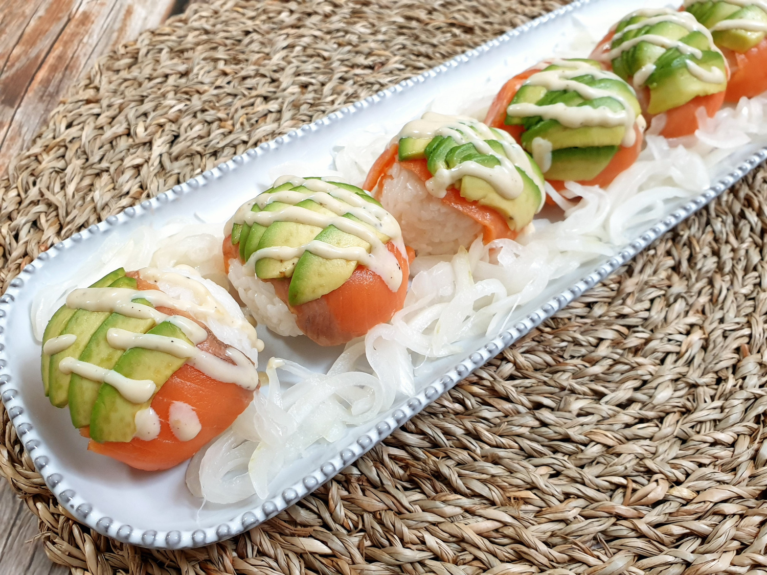 Disfrute de las ricas y cremosas bolas de sushi de aguacate y salmón ahumado, perfectamente complementadas por la cebolla encurtida, ácida y crujiente. ¡Esta combinación es verdaderamente deliciosa!