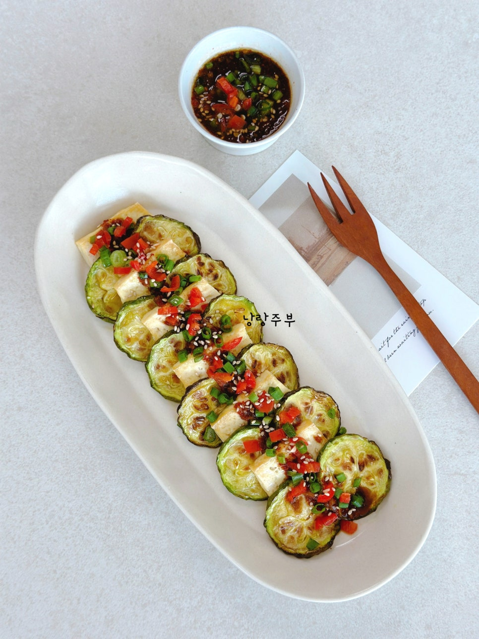 ¡Voilà! Aquí tienes tu calabacín y tofu perfectamente dorados, recién salidos de la freidora de aire. Incluso sin el glaseado de soja, la dulzura natural del calabacín y el sabor a nuez del tofu crean una maravillosa experiencia de sabor. ¡Puedes disfrutarlos solos antes de añadir el glaseado!