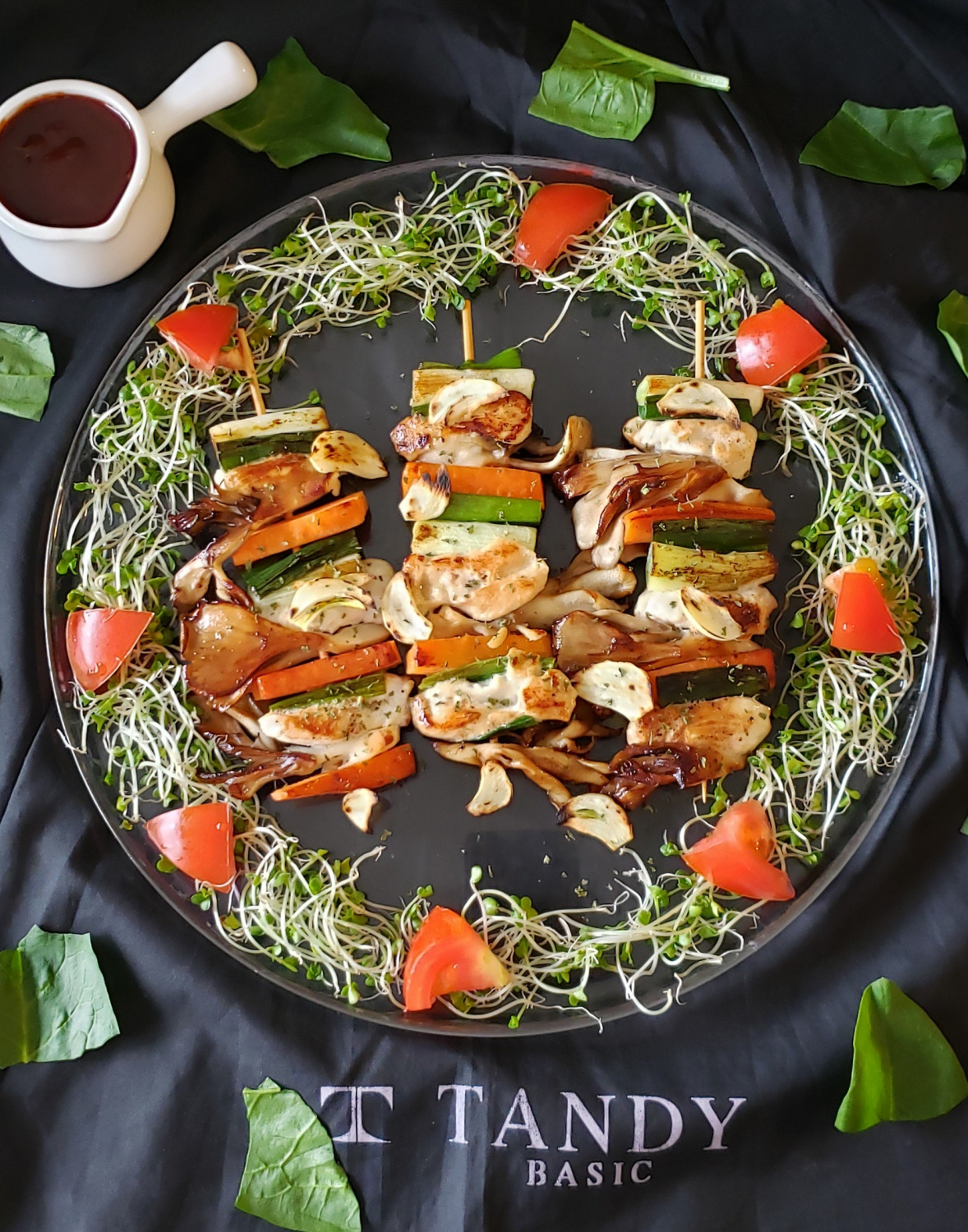 Estas brochetas de solomillo de pollo están impregnadas con los aromáticos olores del ajo y la mantequilla. Mientras la carne se asa, el delicioso aroma a mantequilla y ajo impregna el aire. La sutil fragancia de las setas y las cebolletas añade placer a la cocina. Una salsa barbacoa ligeramente ácida complementa perfectamente las brochetas, y permanecen deliciosamente tiernas incluso cuando se sirven a temperatura ambiente. Son ideales para recibir invitados o como un capricho especial.