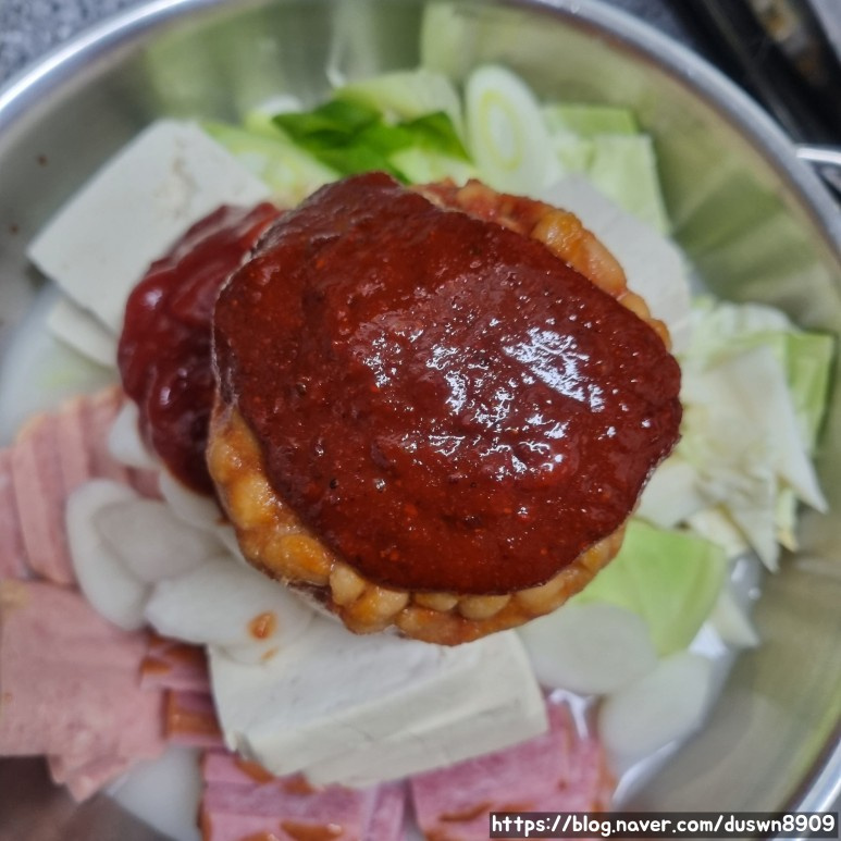 Puede que te preguntes por el kétchup en el Budae Jjigae, pero añade 2 cucharadas de kétchup a la salsa y mezcla bien. Su sabor característico apenas se nota; en su lugar, aporta un dulzor sutil y profundidad.