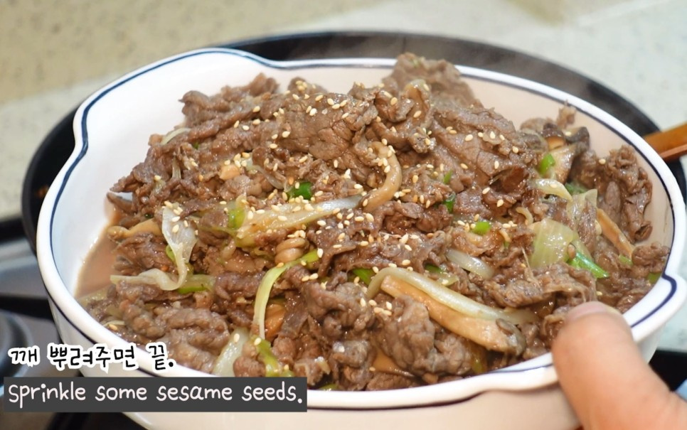 Una vez que el Bulgogi esté bien cocido, espolvorea con semillas de sésamo para un toque final. ¡Disfruta de tu delicioso y súper sencillo Bulgogi de Ternera con un tazón de arroz caliente! ❤