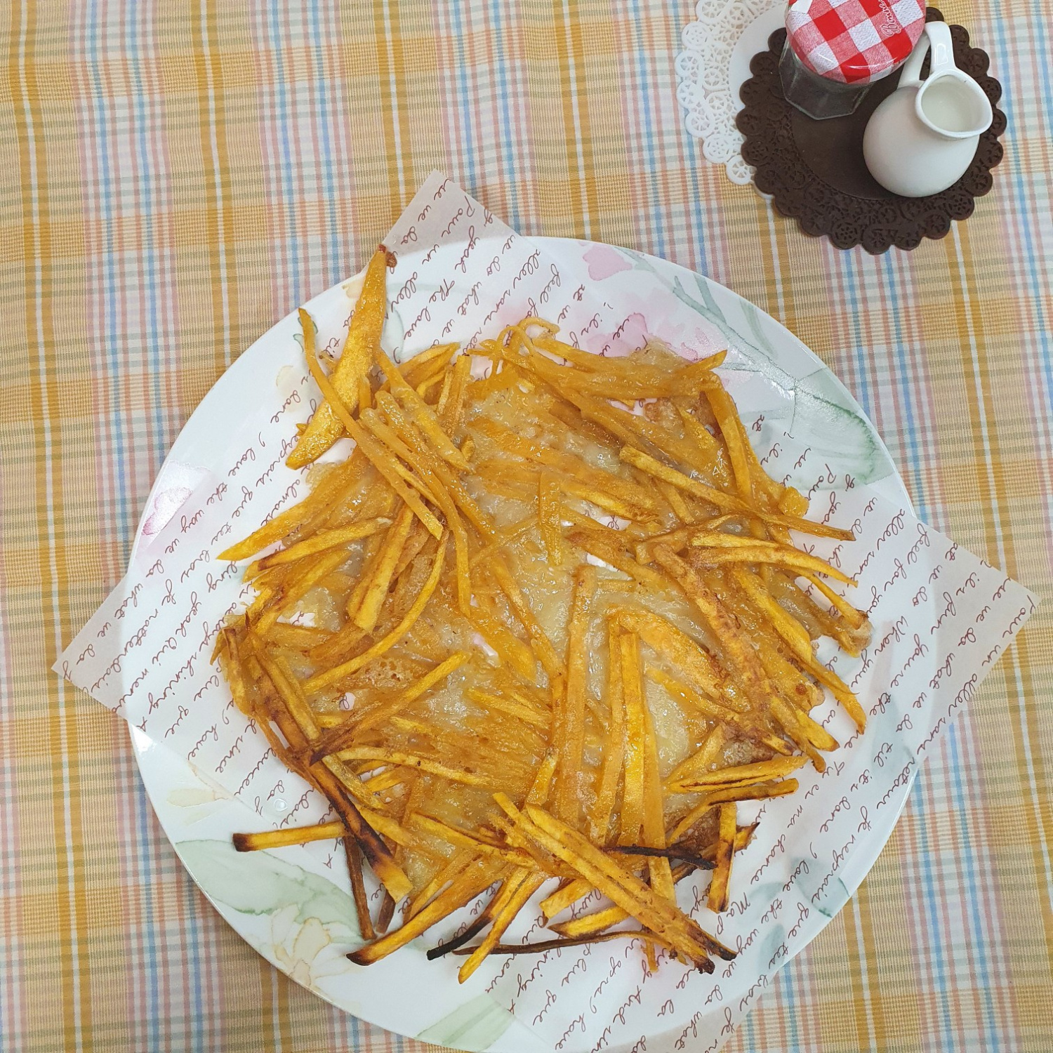 Enjuaga la batata cortada en juliana con agua fría para eliminar el exceso de almidón. Este paso evita que los trozos de batata se peguen entre sí y ayuda a conseguir una textura más crujiente. Enjuaga ligeramente unas 1-2 veces bajo el chorro de agua.