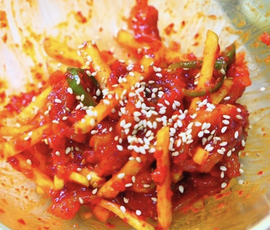 Finalmente, añade los chiles Cheongyang picados y una generosa pizca de semillas de sésamo para terminar. ¡Los colores vibrantes y el aroma a nuez lo hacen aún más apetitoso! Aunque es delicioso comerlo de inmediato, los sabores se fusionarán maravillosamente a medida que el rábano se ablande con el tiempo, creando un sabor aún más delicioso. El rábano equilibra la salinidad y añade un elemento refrescante, lo que lo convierte en un acompañamiento perfecto para el arroz. Este es un plato que preparo con frecuencia cuando me sobran calamares en escabeche, desde que apareció en ‘Sumi’s Side Dish’.