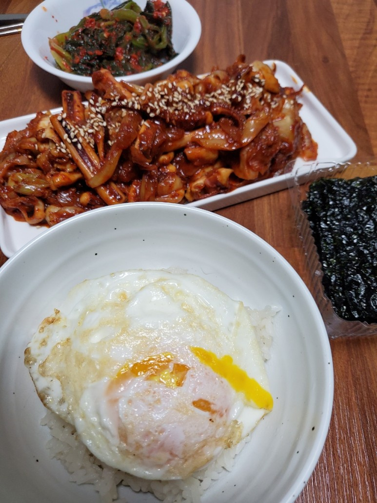 ¡Mi forma favorita de disfrutar estos calamares salteados! Rompe un huevo escalfado perfectamente (con la yema blanda) por encima, mézclalo todo y envuélvelo en algas nori tostadas y crujientes. ¡Esta combinación es absolutamente divina! Siéntete libre de añadir hojas de perilla o lechuga para darle un toque extra de frescura.