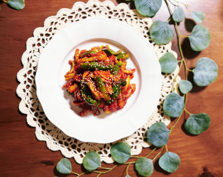 Finalmente, añade las cebolletas y los pimientos verdes coreanos, junto con una pizca de pimienta negra. Remueve brevemente para combinar todo. Los sabores picantes y dulces de los calamares se mezclarán maravillosamente con las verduras, ¡y estará listo!