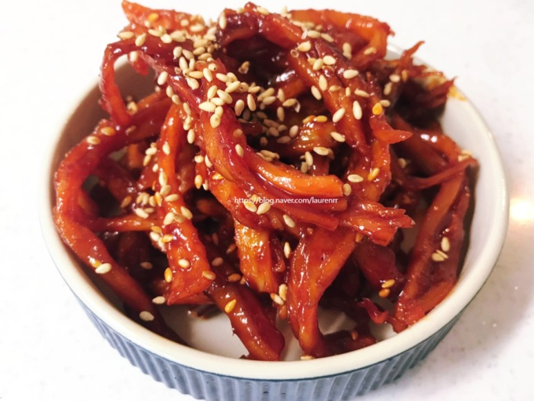 Salteado de Calamares Secos Deshebrados Suave y Tierno con Sirope de Jengibre: Un Plato Coreano que Agrada a Todos