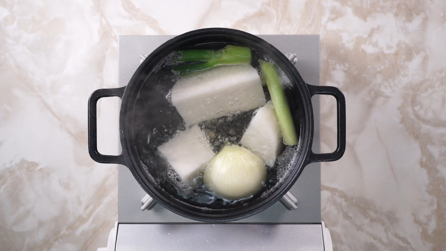 Comienza vertiendo 1 litro de caldo de kombu dashi, que ha sido remojado previamente en agua fría, en una olla. Es importante remojar el kombu en agua fría para extraer su sabor suavemente; hervirlo directamente puede liberar una sustancia viscosa.