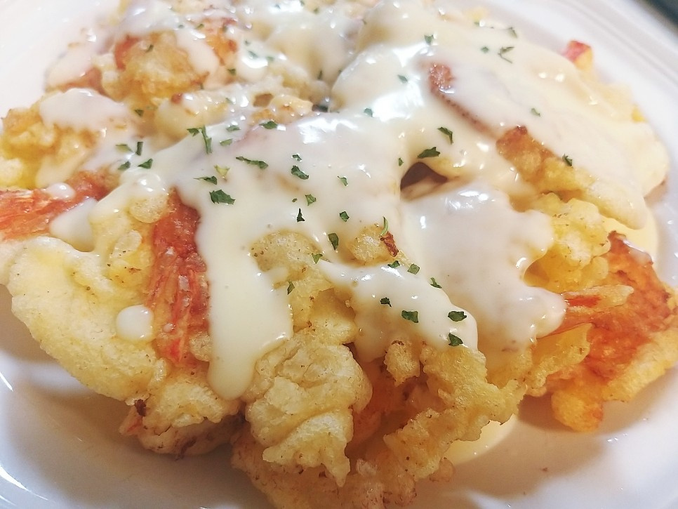 Finalmente, vierte generosamente la salsa cremosa caliente sobre los camarones crujientes en el plato. Para un toque adicional de atractivo visual y aroma, espolvorea un poco de perejil seco por encima. ¡Tu elegante plato de camarones cremosos está ahora completo!