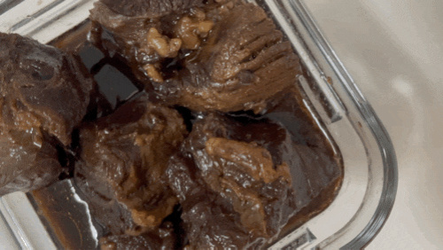Una vez que el líquido se haya reducido un poco y la carne haya absorbido algo de sabor, agrega el agua y la salsa de soja restantes (añade más si es necesario) y continúa estofando durante otros 30 minutos. Revuelve la canilla de res ocasionalmente para asegurar que esté uniformemente cubierta con la salsa.