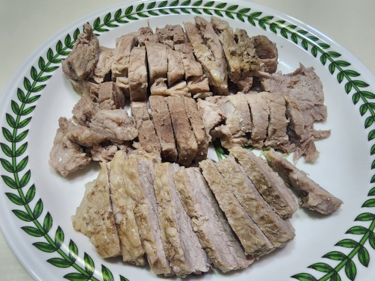 Transfiere con cuidado el sueyok cocido a un plato para servir y córtalo en trozos del tamaño de un bocado. Cortarlo mientras todavía está caliente y humeante asegurará cortes más limpios sin que la carne se desmorone.