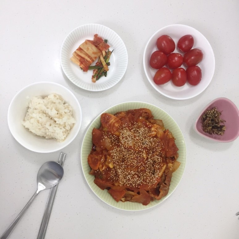 La diferencia entre Duruchigi y Jeyuk-bokkeum puede ser un poco confusa, ¡pero hoy decidí que era el día perfecto para preparar este plato! Mi esposo mencionó que el Chef Baek Jong-won dijo que no importa si marinas la carne o no para el Duruchigi, así que lo intenté sin marinar. Como siempre, ¡los platos de cerdo son deliciosos sin importar cómo se preparen! Esta receta es un éxito asegurado, con cerdo tierno cubierto en una salsa sabrosa, ligeramente dulce y picante, complementada por la deliciosa textura de los pasteles de arroz y el crujido de las verduras frescas. Es una comida fantástica para cualquier día, perfecta para el almuerzo o la cena.