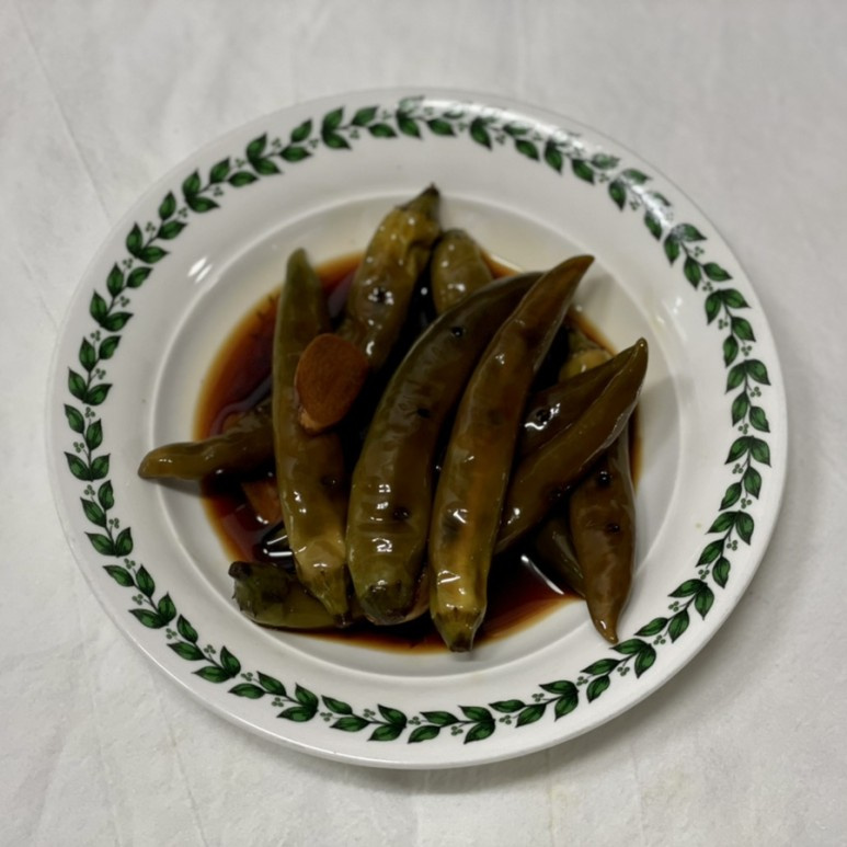 He transferido los chiles en conserva terminados a un plato para servir. ¡Miren! El adobo de salsa de soja ha permeado maravillosamente incluso el interior de los chiles perforados, y el ajo en rodajas finas fermentado junto a ellos ofrece una deliciosa textura crujiente. ¡Estos deliciosos chiles en conserva son verdaderamente un acompañamiento ideal para el arroz! 🙂