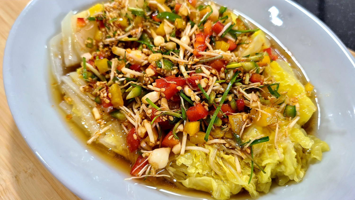 Les presentamos un plato de col china tiernamente cocida al vapor, que combina maravillosamente con un aderezo aromático de cebollino silvestre. La col tierna al vapor, junto con la salsa ligeramente picante y fragante, crea una comida verdaderamente especial. ¡Disfruten de esta receta sencilla pero elegante que hará su mesa más festiva! Para ver los pasos detallados de la cocina, también pueden consultar el video de YouTube: https://youtu.be/FMDcJ6TNeYE