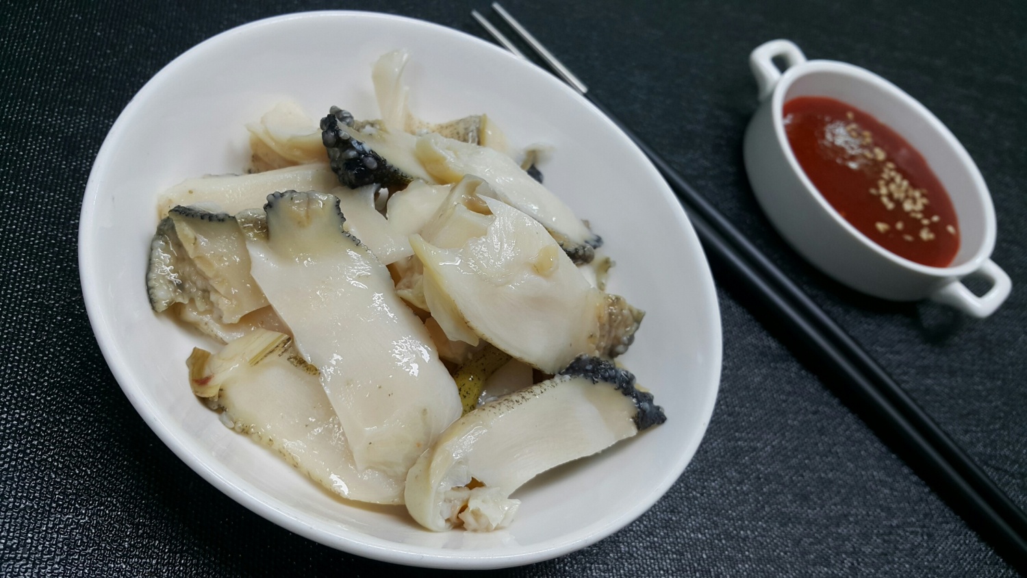 Finalmente, ¡coloca las caracolas marinas hervidas y cortadas de forma atractiva en un plato para una presentación perfecta de tu delicioso plato! Puedes realzar el sabor sirviéndolo con una salsa picante a base de pasta de chile rojo (gochujang) o salsa de soja con wasabi. ¡Disfruta del fresco sabor del mar cómodamente en casa!