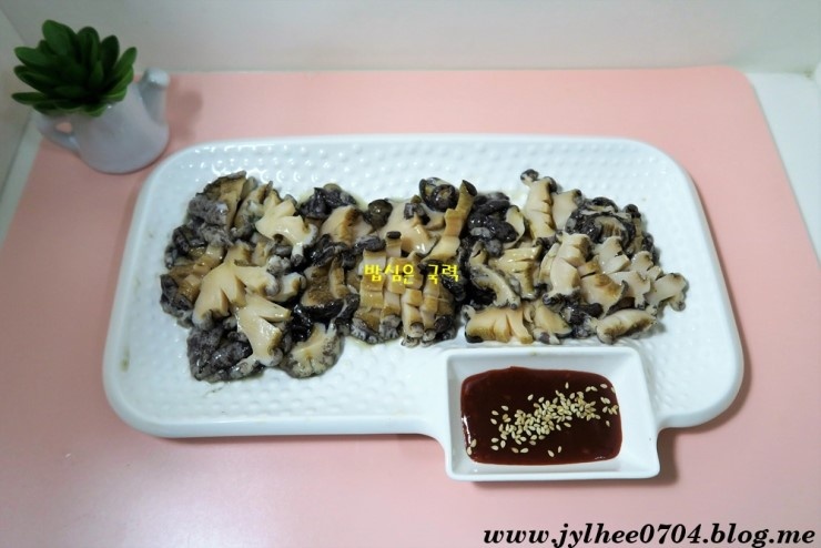 Finalmente, es hora de cortar la carne del abulón. Coloquen la carne del abulón con el lado blanco hacia arriba. Usando un cuchillo afilado, hagan cortes finos, casi como si estuvieran fileteando. Después de hacer estos cortes superficiales, corten el abulón en el tamaño de porción deseado. Hacer cortes finos resultará en una textura aún más tierna al masticar. Coloquen el sashimi de abulón cortado de forma atractiva en un plato y sírvanlo con salsa Gochujang para una experiencia deliciosa.