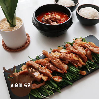 Ingredientes Principales- 300g de Costilla de Cerdo (Hangjeongsal), cortada en trozos del tamaño de un bocado