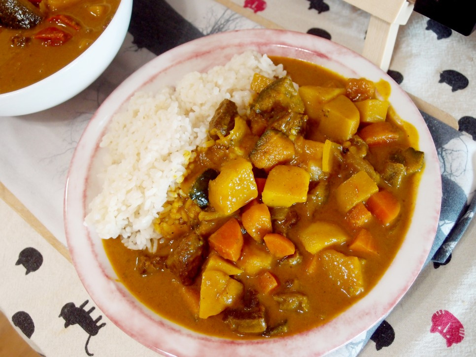¡Tu curry cremoso y aromático de calabaza, realzado con cúrcuma y garam masala, está listo! Sírvelo generosamente sobre un bol de arroz caliente para una comida completa y satisfactoria. Personalmente, me encantan los curris con cúrcuma por su aroma profundo y su sabor robusto. No es solo picante; tiene un sabor maravillosamente complejo y satisfactorio que está lejos de ser insípido. Este curry de sabor intenso es versátil: además de disfrutarlo con arroz, puedes usarlo como salsa para platos como el tonkatsu o incluso como dip para pan. Es una adición verdaderamente deliciosa a tu repertorio culinario.
