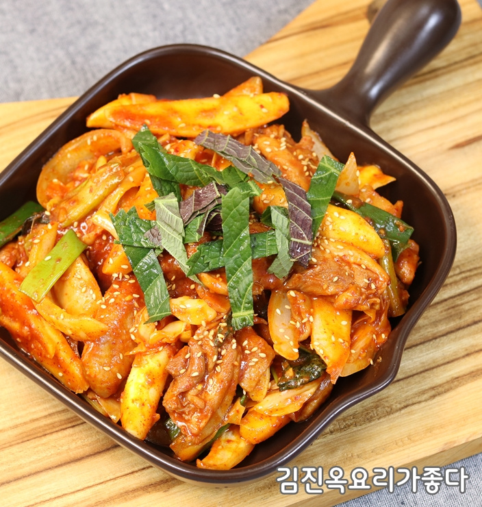 5. **Cocina el Dakgalbi:** Calienta una sartén grande o wok a fuego medio. Añade el pollo marinado y la batata preparada. Vierte los 50ml de agua (o caldo) y sofríe durante unos 10 minutos, permitiendo que el pollo comience a cocinarse. Una vez que el pollo y la batata estén parcialmente cocidos, añade la cebolla, la col, los pasteles de arroz y la cebolleta a la sartén. Mezcla todo y continúa salteando a fuego medio hasta que el pollo esté completamente cocido. Si la sartén parece demasiado seca durante la cocción, añade un poco más de agua para evitar que se pegue. Cuando el pollo esté cocido, incorpora las hojas de perilla picadas y remueve solo una o dos veces para que se ablanden. Prueba y ajusta la sazón si es necesario añadiendo un poco más de gochujang o salsa de soja. ¡Disfruta de tu delicioso Dakgalbi casero!