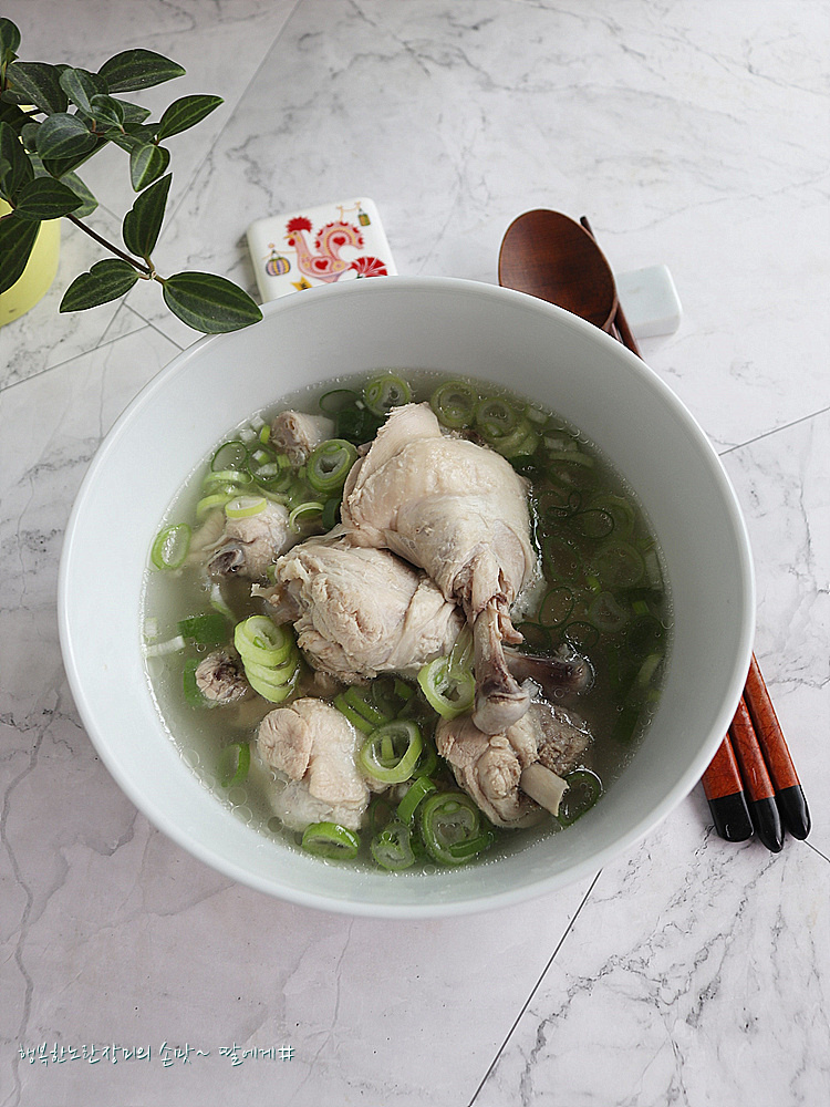 Dispón las piezas de pollo cocido (muslos, alitas, etc.) de forma atractiva en un tazón grande para servir. Vierte generosamente el caldo de pollo caliente y claro sobre el pollo. Adorna con abundante cebolleta picada fresca. Finalmente, sazona con sal al gusto para un sabor perfectamente equilibrado. En lugar de desmenuzar la carne de un pollo entero, servir las partes enteras hace que sea más agradable comer la carne directamente. Hacer Dakgomtang en casa es realmente fácil, ¿verdad?