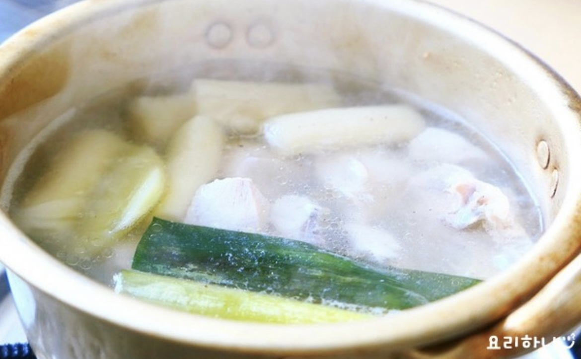 Primero, preparemos el pollo para hacer el caldo rico y refrescante de Dakhanmari. Si usa pollo para Dakbokkeumtang, enjuáguelo bien bajo agua corriente. El Chef Baek Jong Won usó un pollo entero, pero siéntase libre de usar el corte que prefiera. Coloque el pollo en una olla y agregue aproximadamente 2 tazas de agua, suficiente para cubrir el pollo. Para un sabor más limpio y eliminar cualquier olor a caza, agregue un tallo de cebolleta y media cebolla, cortadas en trozos grandes. Si tiene vino de cocina o soju, agregar aproximadamente 1/3 taza realzará aún más el sabor y reducirá cualquier olor desagradable (opcional). Ahora, lleve esta mezcla a ebullición a fuego alto para comenzar a extraer el caldo de pollo.