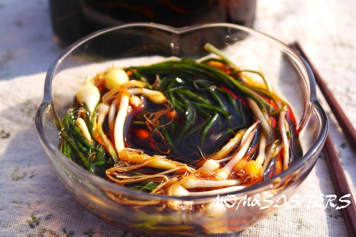 Han pasado dos días completos, y la salmuera del Jangajji ha tenido tiempo suficiente para infundir las cebolletas silvestres. He sacado una pequeña porción para probarla, anticipando la deliciosa mezcla de sabores salados y picantes.