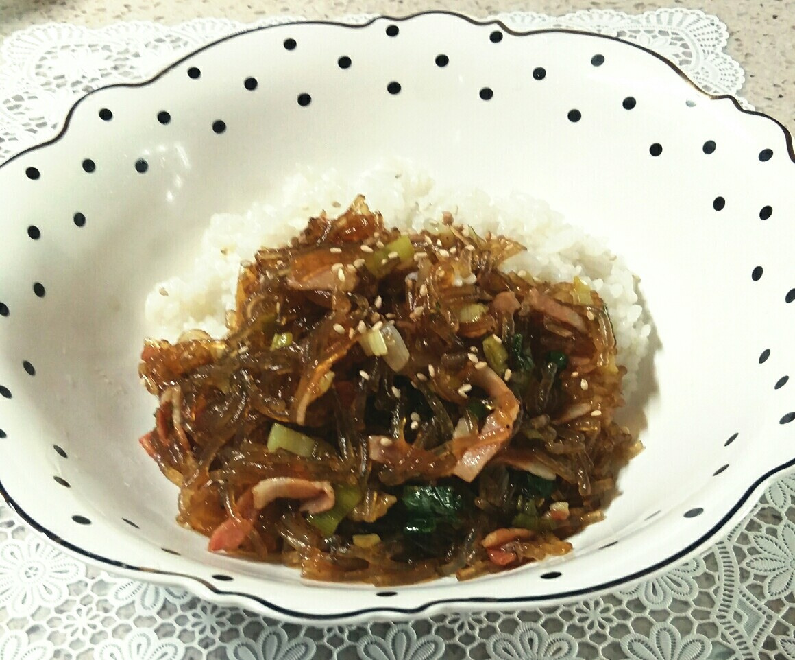 Esta mañana no tenía ingredientes especiales para el desayuno. Encontré un puñado de fideos de vidrio (dangmyeon) remojados en la nevera y decidí saltearlos con un poco de tocino. ¡El resultado fue sorprendentemente delicioso! Este plato es una forma fantástica de usar fideos y tocino sobrantes, creando una comida satisfactoria con un mínimo esfuerzo.