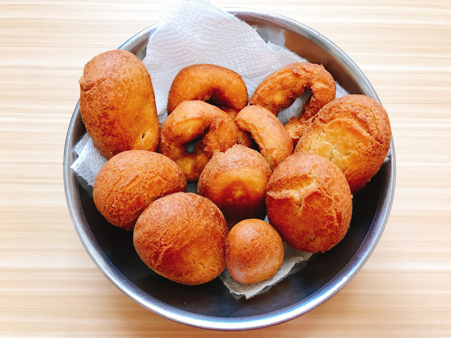 ¡Voilà! ¡Nuestras primeras dos donas “Seng” están listas! Retira las donas fritas a una rejilla cubierta con papel de cocina para que escurran el exceso de aceite. Fríe las donas restantes de la misma manera.