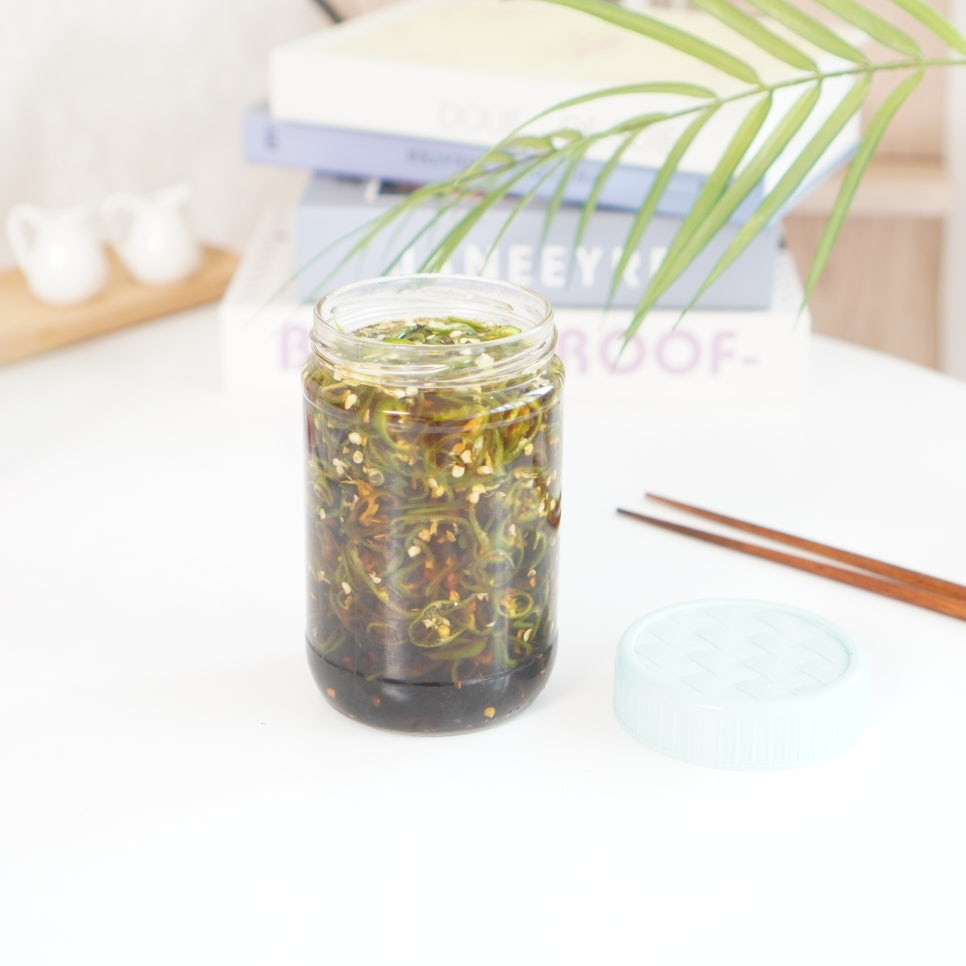 ¡Un acompañamiento irresistible para esos días sin apetito, estos chiles Cheongyang encurtidos con base de salsa de soja ofrecen una textura crujiente deliciosa y un equilibrio perfecto entre picante y dulce! Esta receta es muy versátil y puede usarse para otros tipos de chiles como el chile pepino coreano (oigochu) o el chile crujiente (achigochu). Su sencillez la hace ideal para principiantes.
