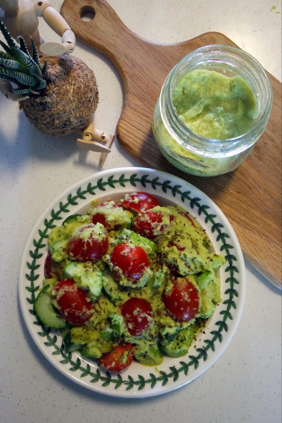 Sirvan generosamente el aderezo cremoso de aguacate recién hecho sobre el pepino y los tomates cherry preparados.