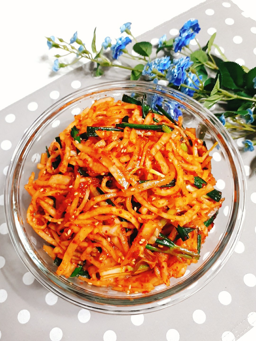 ¡Así tu deliciosa ensalada de colirrábano y cebolleta está lista! Ofrece un crujido agradable del colirrábano y un aroma refrescante de las cebolletas. A diferencia de la ensalada de rábano, el colirrábano proporciona una masticabilidad satisfactoria y no libera demasiada agua, lo que la convierte en un excelente acompañamiento que se puede conservar durante varios días.