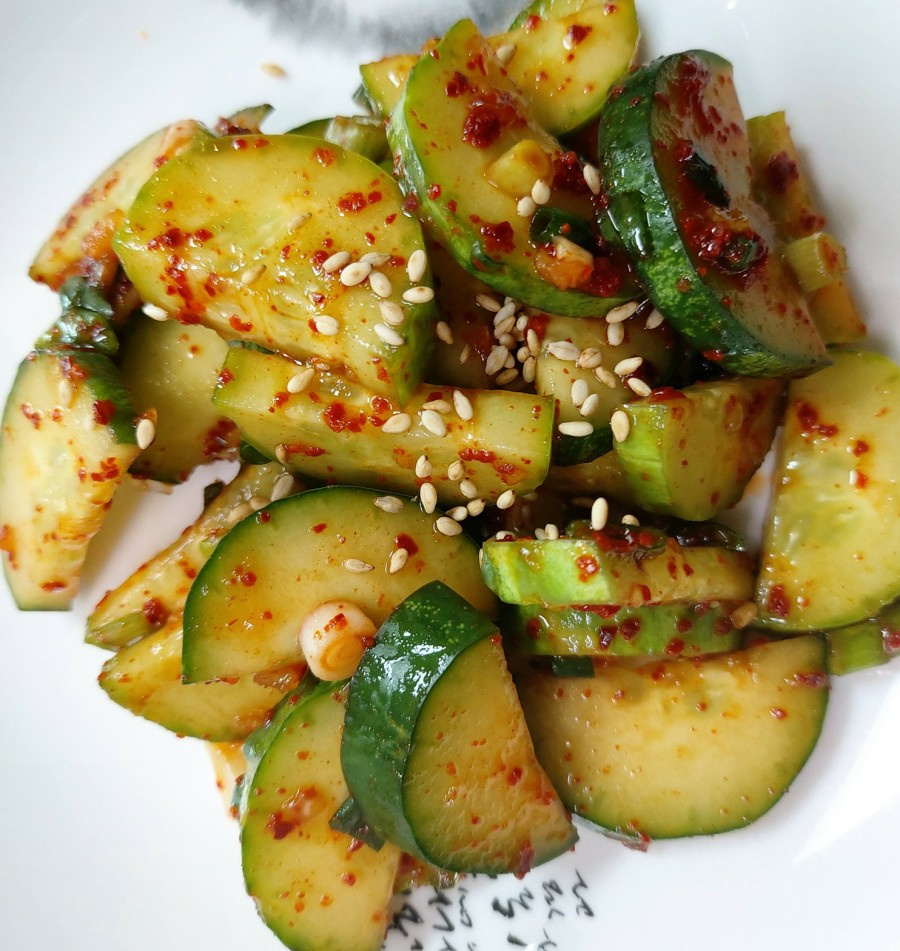 Ahora, agregue todos los ingredientes del aderezo que determinarán el sabor de su ensalada de pepino. Añada 1 cucharada de gochugaru, 1 cucharadita de ajo picado, 1 cucharada de salsa de soja, 1 cucharada de salsa de anchoas, 1 cucharadita de vinagre, 1 cucharadita de cebolleta picada y 1 cucharadita de semillas de sésamo para darle un aroma a nuez.