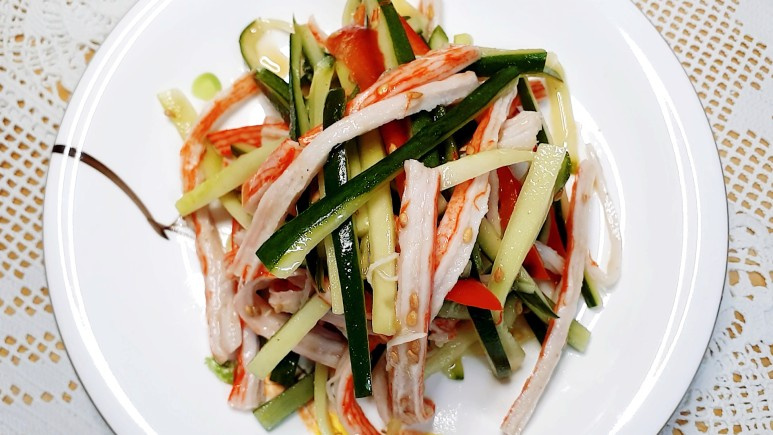 ¡Y aquí lo tienes! Una ensalada de pepino y palitos de cangrejo perfectamente crujiente y refrescante, lista para tentar tu paladar. ¡Disfruta de este delicioso plato!
