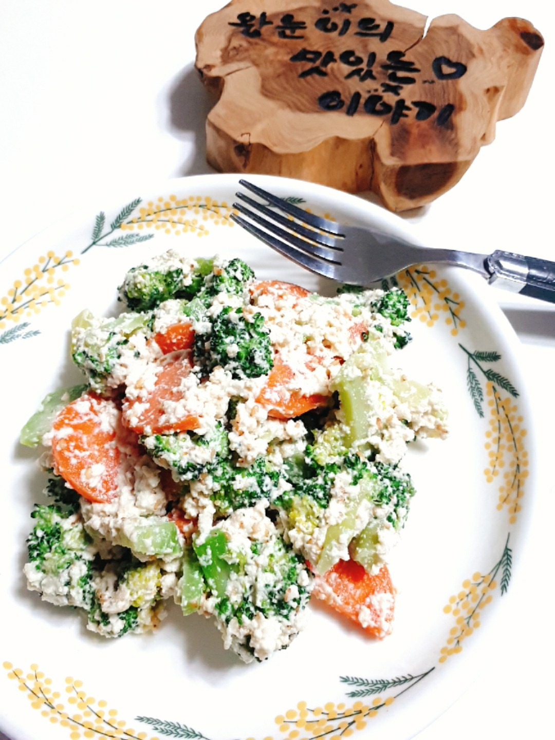Finalmente, añade el brócoli y la zanahoria escaldados al bol con el tofu y los aderezos. Utiliza una espátula o tus manos para mezclar y machacar suavemente todo. Deshaz los grumos más grandes de tofu y asegúrate de que las verduras y los aderezos estén distribuidos uniformemente. Mezcla con cuidado para no deshacer las verduras.