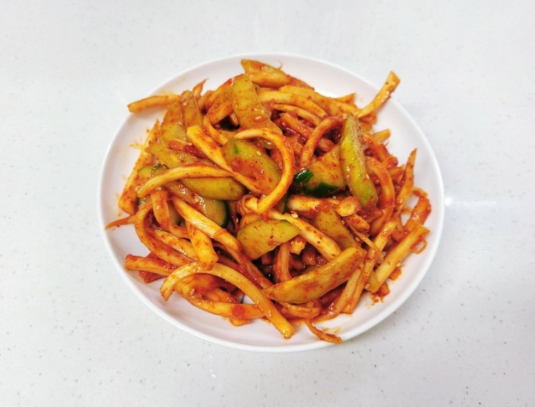 ¡Hice una ensalada de raíz de campanilla y pepino usando raíces de campanilla nacionales compradas en el supermercado! Al comer alimentos grasos, ¡esta ensalada la hace aún más deliciosa con su sabor ácido y refrescante!