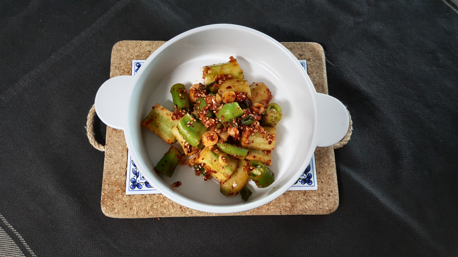 ¡Y aquí la tienes, una deliciosa y maravillosamente crujiente ensalada de pepino y chile! La combinación de verduras frescas y el aderezo sabroso y ligeramente picante seguramente despertará tu apetito. ¡Disfruta de esta deliciosa guarnición con tu comida favorita!