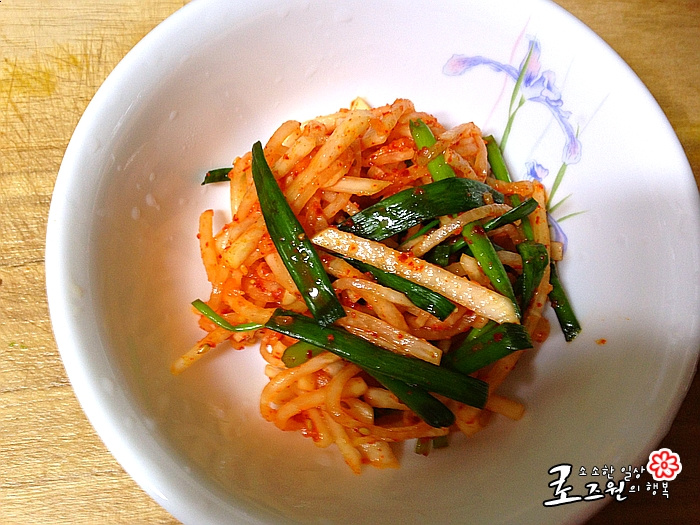 Disfrute de esta deliciosa ensalada de rábano coreano hecha con rábanos frescos de otoño, que resalta su textura crujiente y sabor refrescante. ¡Es perfecta como guarnición para cualquier comida o como topping para bibimbap!