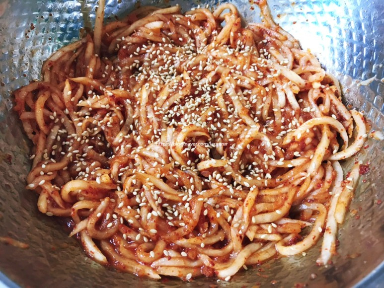 Transfiere el rábano exprimido a un bol y añade todos los ingredientes del aderezo: 2 cucharadas de gochugaru, 1 cucharada de sirope de jengibre, 3 cucharadas de vinagre, 1/2 cucharada de salsa de soja, 2 cucharadas de maesilcheong y 1 cucharada de ajo picado.
