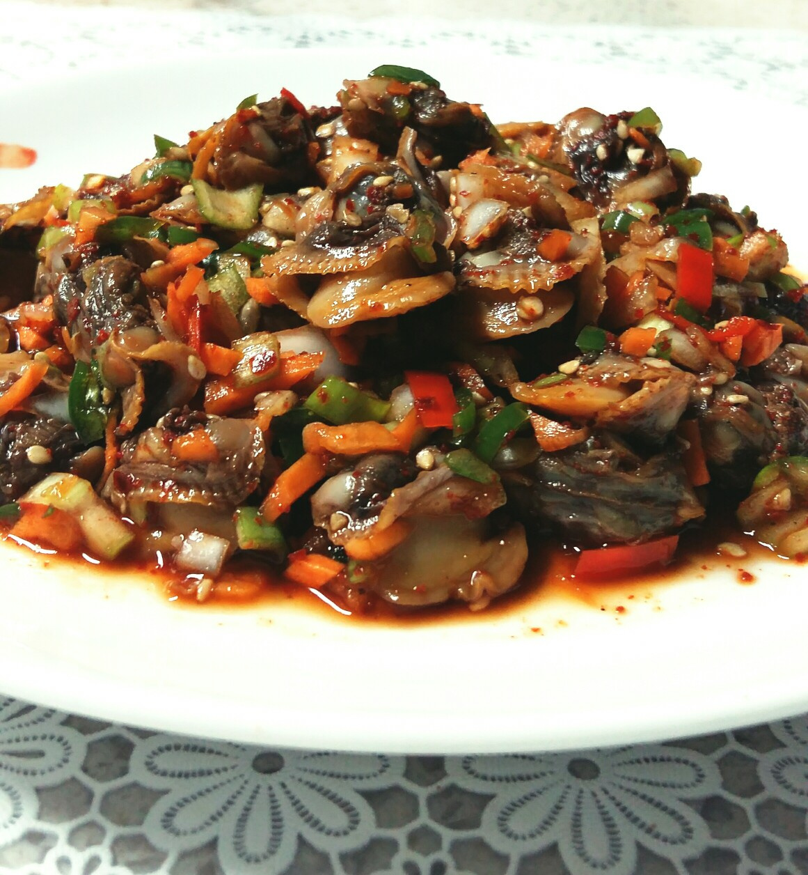 Transfiera la ensalada de berberechos sabrosa y bien mezclada a un plato de servir. Decore con una pizca de semillas de sésamo para un acabado atractivo. Este plato se sirve maravillosamente con arroz recién cocido o como cobertura para bibimbap.