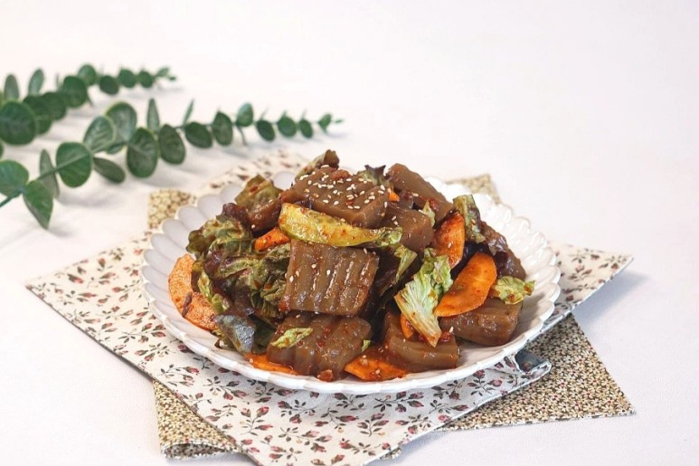 Tu ensalada de gelatina de bellota, elástica y tierna, con verduras crujientes, está completa. ¡Es el capricho perfecto y delicioso para disfrutar con makgeolli en un día lluvioso!
