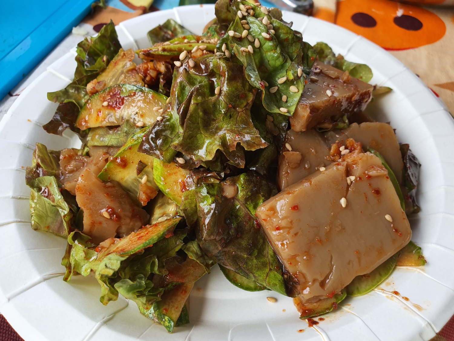 Un plato rápido y fácil, perfecto como aperitivo ligero o como acompañamiento para tus bebidas. Esta ensalada combina la textura masticable de la gelatina de bellota con verduras crujientes para una explosión de sabor refrescante.