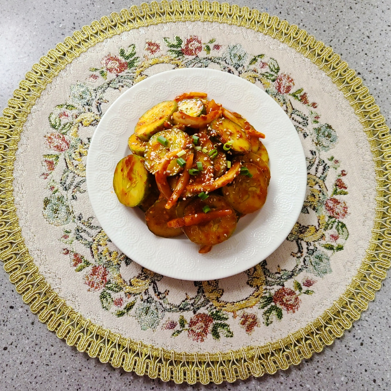 Transfiere el delicioso Oi Muchim a un plato de servir. Decora con un poco más de cebolleta picada o más semillas de sésamo si lo deseas, para una presentación aún más atractiva. ¡Disfruta de tu Oi Muchim perfectamente hecho!