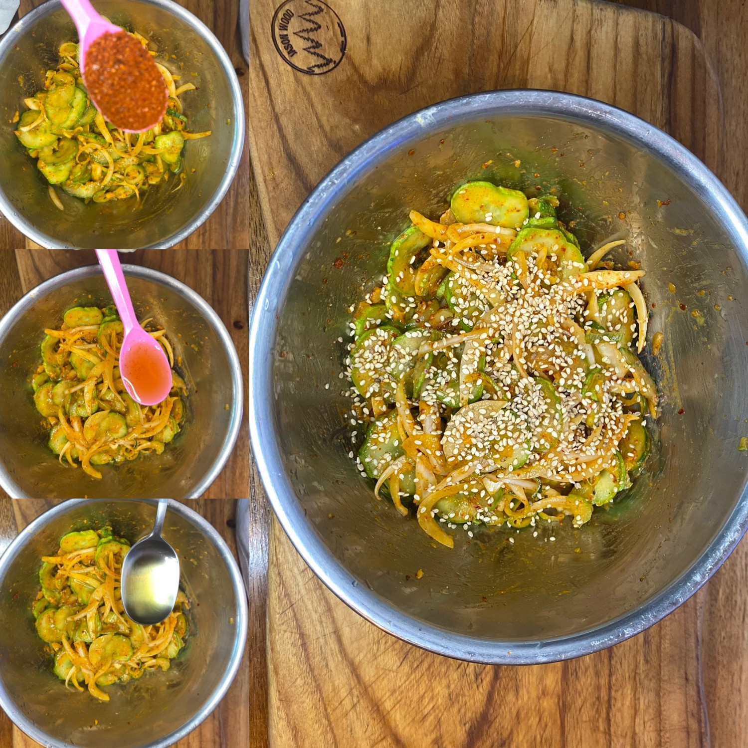 Ahora, añade los ingredientes restantes del condimento: 1 cucharadita de hojuelas de chile rojo finas, 1 cucharada de aceite de sésamo y 3 pizcas de semillas de sésamo tostadas para dar aroma. Para evitar que el exceso de humedad del pepino y la cebolla hagan que la ensalada quede aguada, utiliza palillos para mezclar todo suave y rápidamente. Esto ayuda a cubrir uniformemente las verduras con el condimento.