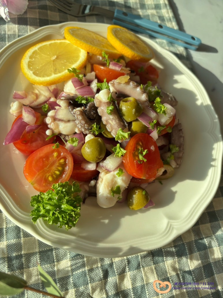 Hoy les presento una receta de ensalada de pulpo y mariscos, perfecta como aperitivo navideño o para acompañar un vino blanco. Utilicé pulpo fresco precortado, fácil de encontrar en el supermercado, para crear esta ensalada maravillosamente masticable y refrescante. A diferencia del pulpo picante salteado, esta versión de estilo mediterráneo, mezclada con tomates cherry, cebolla picada y aceitunas, ofrece un crujido delicioso y un sabor fresco que satisface. El aderezo es una mezcla simple a base de aceite de oliva, con ajo picado, sal y jugo de limón. Se prepara en tan solo 10 minutos: blanquea ligeramente el pulpo y mézclalo con el aderezo de aceite de oliva. Este plato es ideal como comida dietética o como un sencillo aperitivo para vinos. Su presentación atractiva también lo convierte en una opción recomendada para fiestas en casa. Eleva tu celebración navideña con este sabroso plato, disfrutado junto a una copa de vino para un ambiente alegre y festivo.