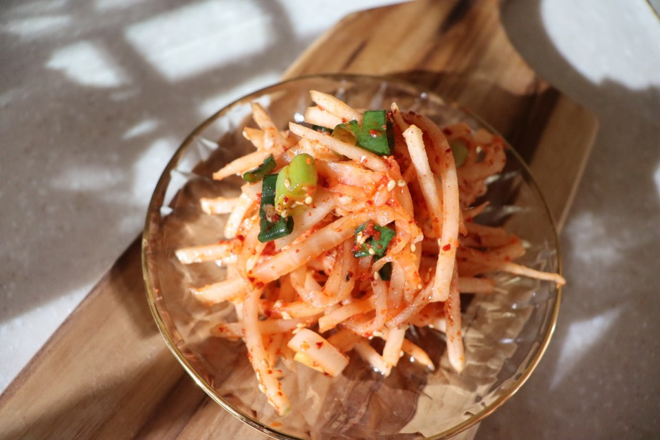 El rábano, conocido como un aid digestivo natural, es particularmente beneficioso en otoño, ¡se dice que es incluso mejor que el ginseng! Cuando tengas poco apetito, un simple y refrescante Mu Saengchae (ensalada de rábano) picante y ligeramente dulce es el remedio perfecto. Mézclalo con arroz blanco, gochujang (pasta de chile coreana) y aceite de sésamo para un delicioso bibimbap que despertará tus papilas gustativas. ¡Comencemos con esta fácil receta para el compañero de arroz definitivo!