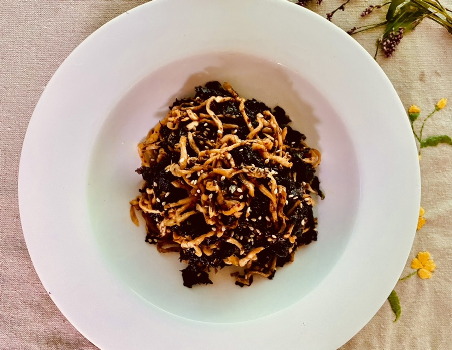 He secado rábanos cortados en tiras finas hasta que están crujientes, creando un tipo único de ‘muchim’ (ensalada sazonada). Estos rábanos se cortan para ‘musaengchae’ (ensalada fresca de rábano), lo que resulta en una textura más fina que el típico ‘myeolchi muchim’ (ensalada de anchoas secas). Esta textura más fina ofrece su propio encanto. En lugar de hojas de perilla, he usado algas ‘gim’ secas y tostadas para mezclar. El rábano dulce y el sabroso ‘gopchang gim’ (un tipo de alga ancha y rizada) se complementan maravillosamente. Este plato es una deliciosa guarnición que marida perfectamente con el arroz.