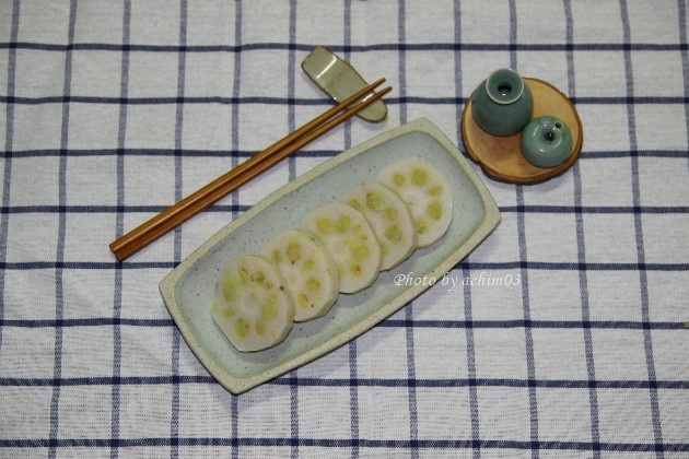 Agregue una pizca de sal al agua hirviendo antes de añadir las rodajas de raíz de loto; esto ayuda a que mantengan su textura crujiente. Hierva la raíz de loto durante unos 7 minutos. Una vez cocida, sumérjala inmediatamente en agua fría para que se enfríe. Séquelas suavemente con toallas de papel y extiéndalas sobre un plato.