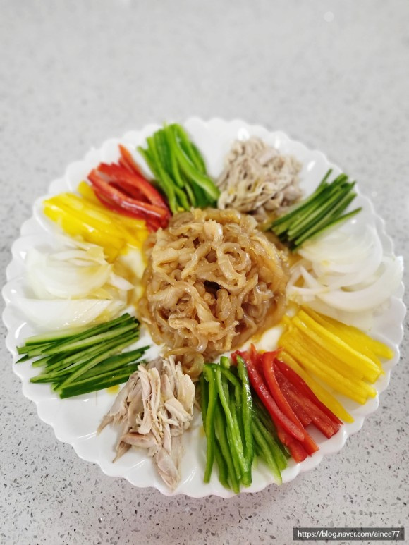 Coloca la medusa marinada en el centro de la fuente, sobre las verduras y el pollo dispuestos. Esta presentación añade un toque fresco y atractivo al plato.
