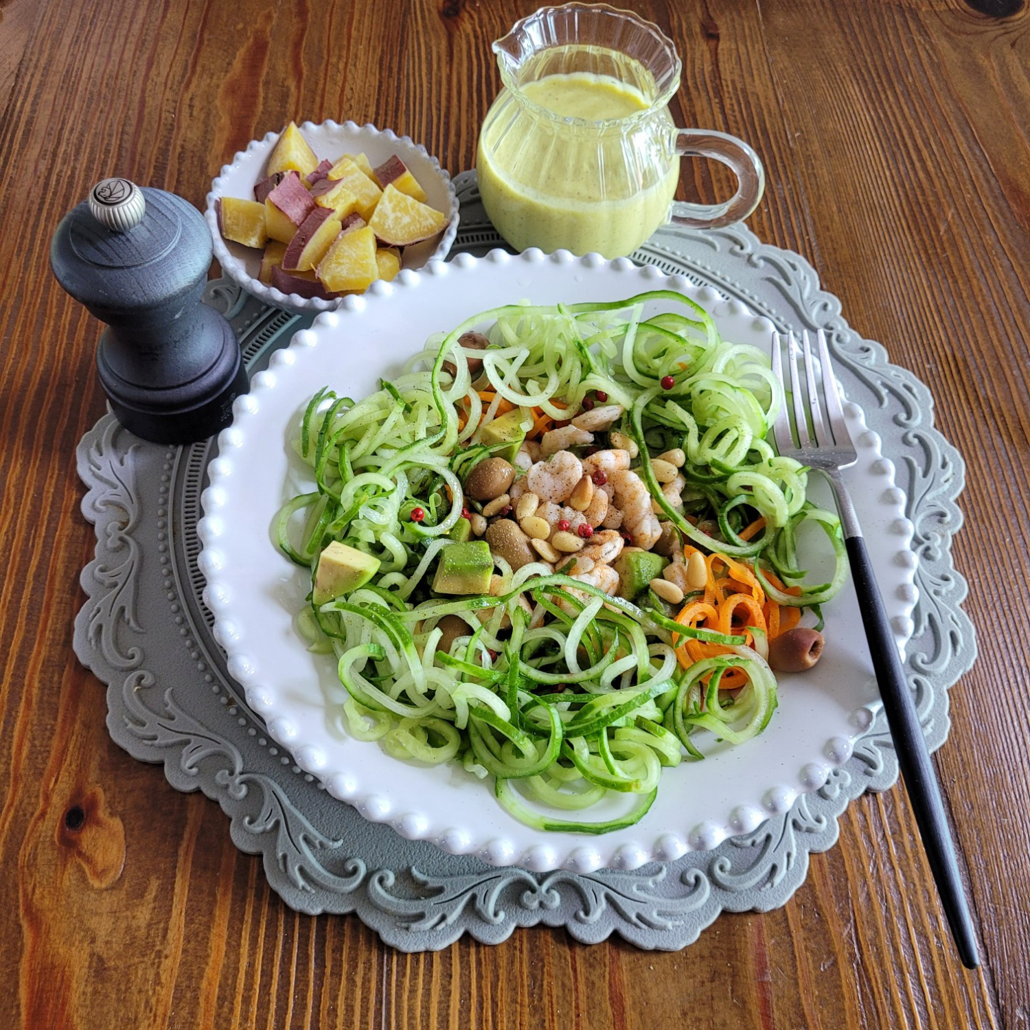 Para mantener mi salud, practico comer ensaladas en una o dos comidas al día. Esta ensalada en particular es una creación que utiliza ingredientes que ya tenía en casa y que mi intestino adora. Históricamente, las semillas de cáñamo se han conocido por sus beneficios para la salud intestinal e incluso se usaban en la medicina tradicional coreana. El aderezo, a base de semillas de cáñamo, obtiene su dulzura de la piña en lugar de azúcar. Los carbohidratos se mantienen al mínimo con la batata, y las proteínas provienen de los camarones, logrando un equilibrio nutricional. Esta ensalada está repleta de nutrición y salud para una comida satisfactoria. ^^