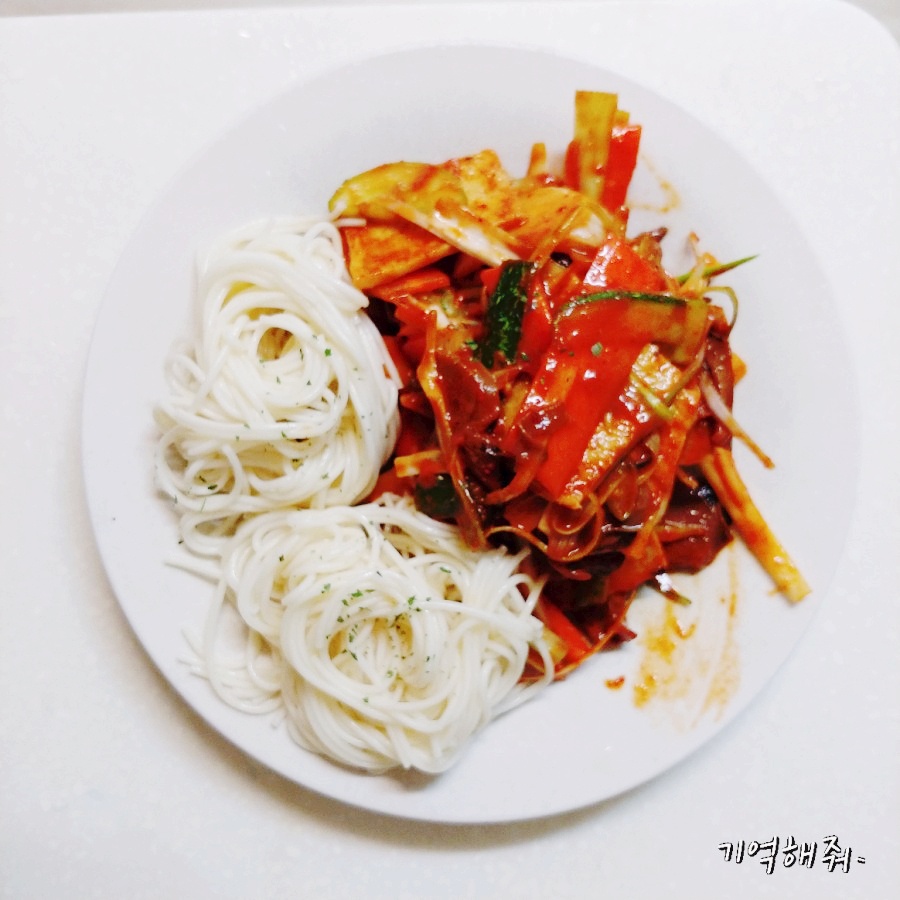 Hierve los fideos somyeon en abundante agua hasta que estén aproximadamente 1 minuto menos cocidos que lo que indican las instrucciones del paquete. Escúrrelos y enjuágalos bajo agua fría. Añade los fideos cocidos al bol con la mezcla de caracolas marinas y verduras. Mezcla suavemente todo hasta que esté bien combinado, y tu refrescante y picante-dulce ensalada de caracolas marinas con fideos estará lista. ¡Disfruta de la deliciosa combinación de verduras crujientes, fideos elásticos y caracolas marinas jugosas! (Consejo: Servir con un huevo duro o algas desmenuzadas realza el sabor.)